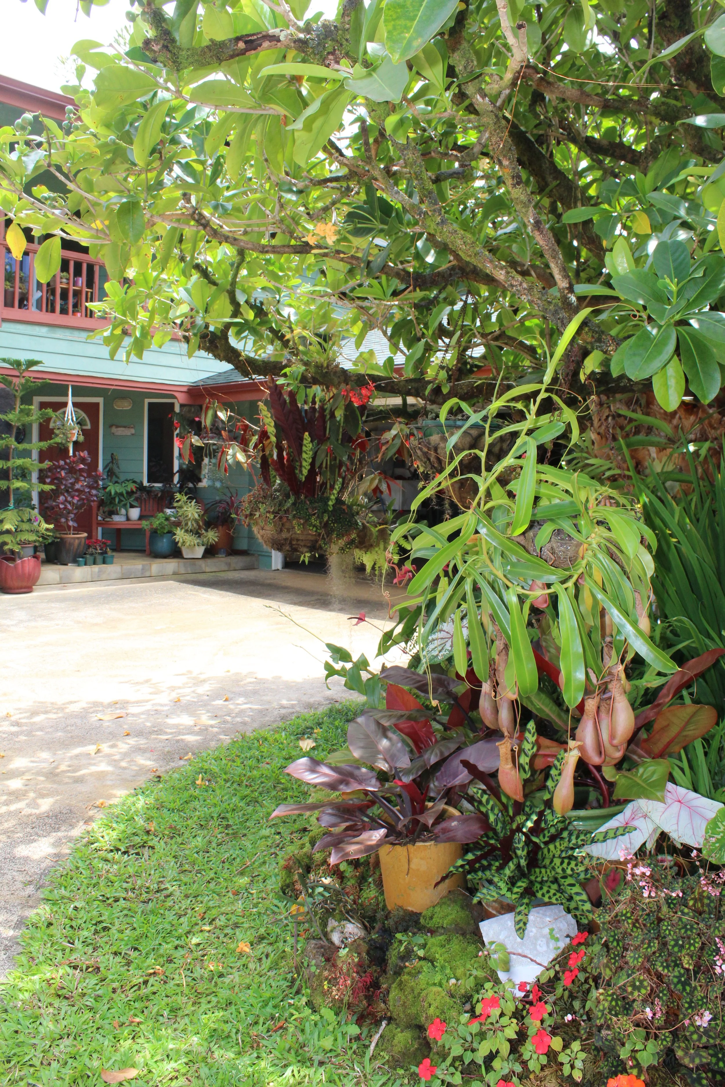 Puakenikeni tree with hanging baskets of Pitcher Plants and Calatheas