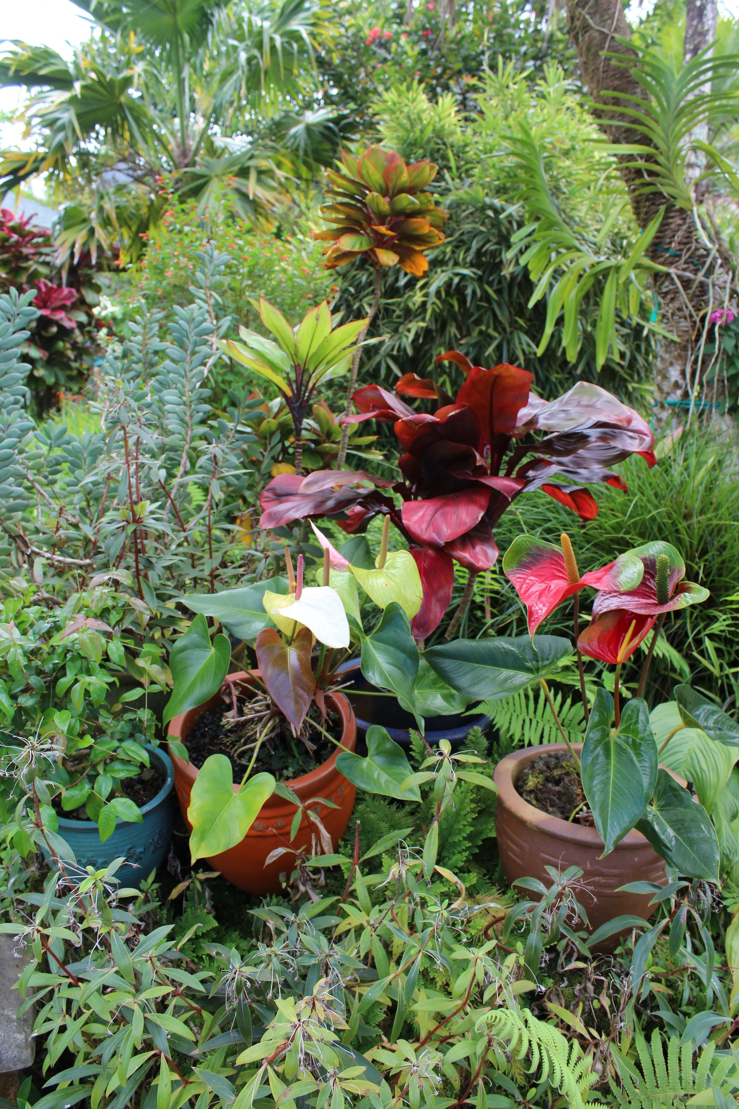 Mary’s collection of potted Anthuriums complements her garden