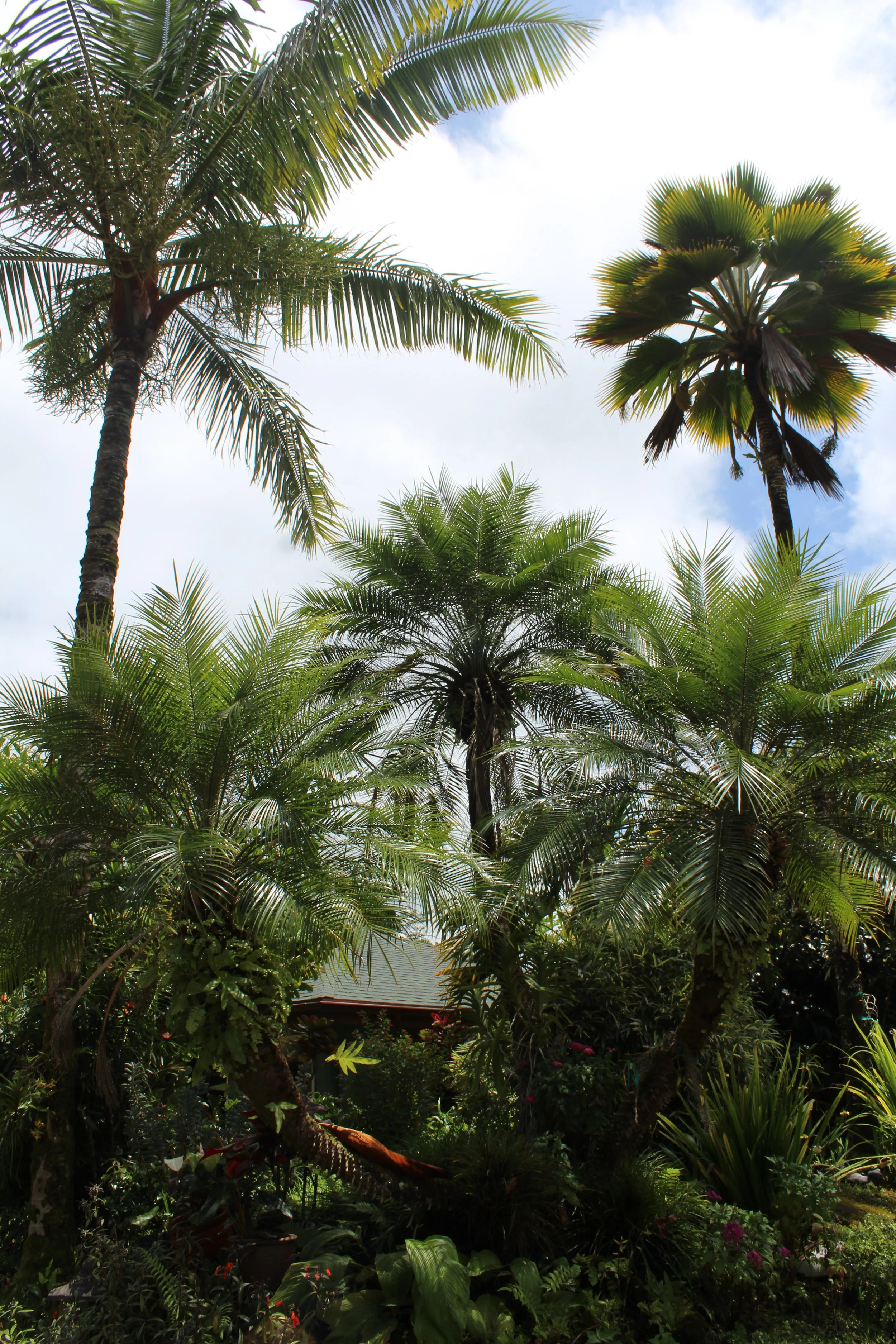 Whimsical triple-trunk Date Palm under the Teddy Bear Palm and Loulu Palm